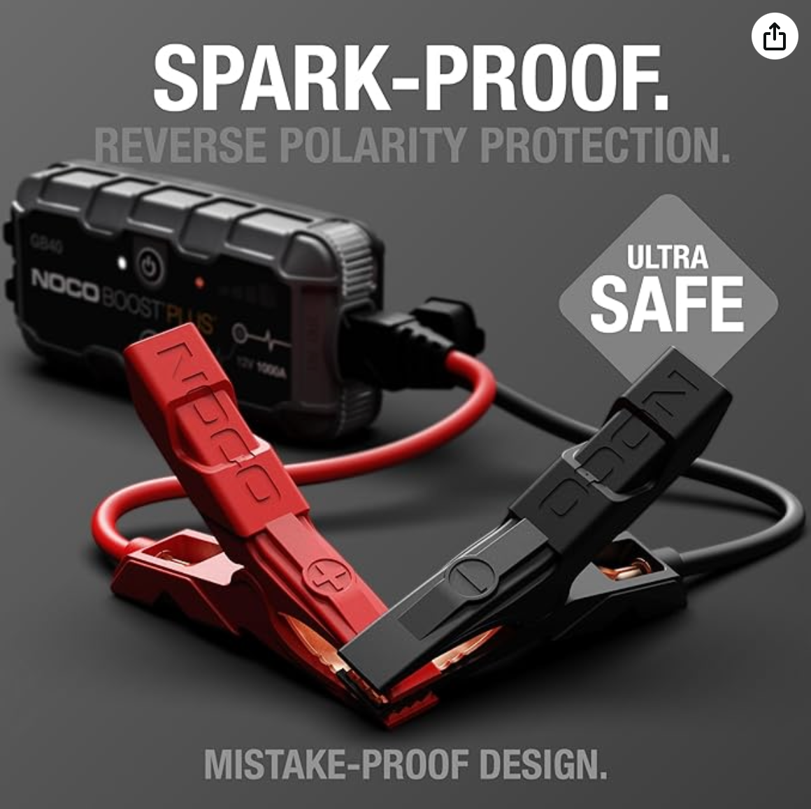 - WHAT’S IN THE BOX — GB40 jump starter, heavy-duty clamps, USB-C charging cable, and microfiber storage bag. Backed by a 1-year warranty and engineered in the USA.